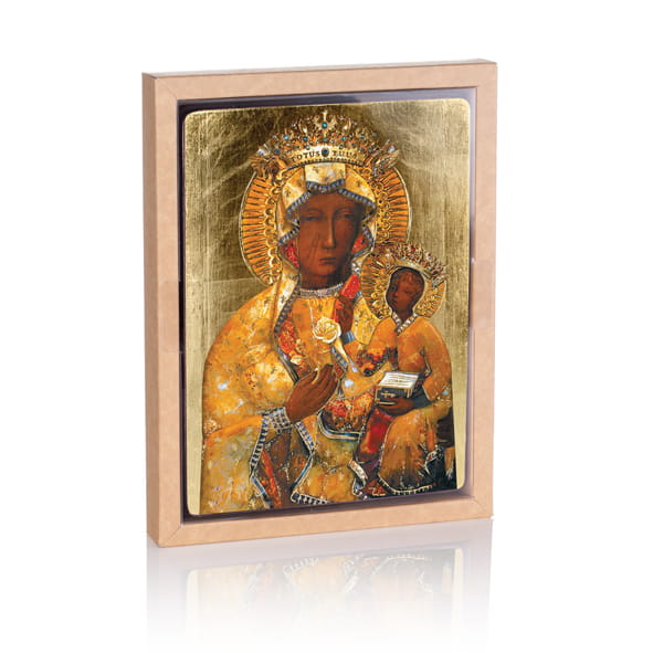 - Ręczne złocenie – nadaje sakralny blask i podkreśla piękno wizerunku.