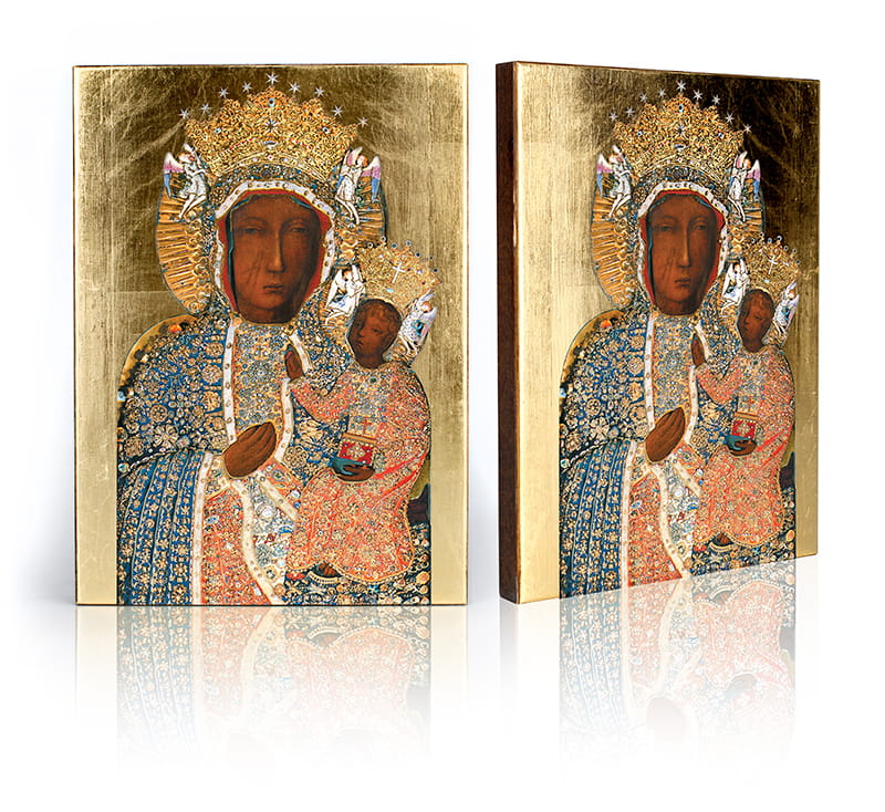 - Ręczne złocenie – nadaje sakralny blask i podkreśla piękno wizerunku.