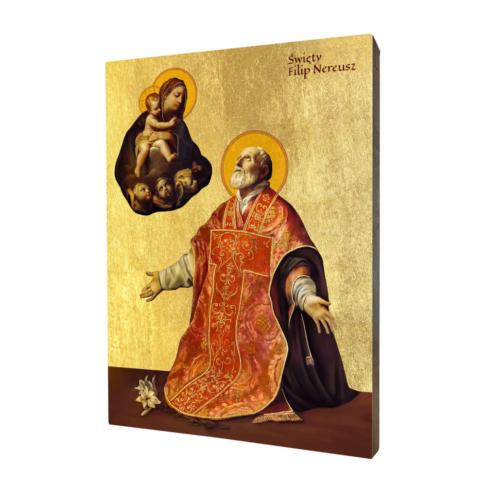 Ikona Świętego Filipa Neri, wykonana została na podwójnie zagruntowanej desce lipowej. Drzewo zostało dodatkowo uszlachetnione pozłotą przypominają złoto płatkowe. Sam wizerunek naniesiony jest bezpośrednio na deskę przy użyciu specjalnej techniki druku. Ikona zabezpieczona specjalnym werniksem na bazie żywicy. Ze względu na swój piękny i estetyczny wygląd ikona może stanowić niezwykły prezent religijny na każdą okazję.