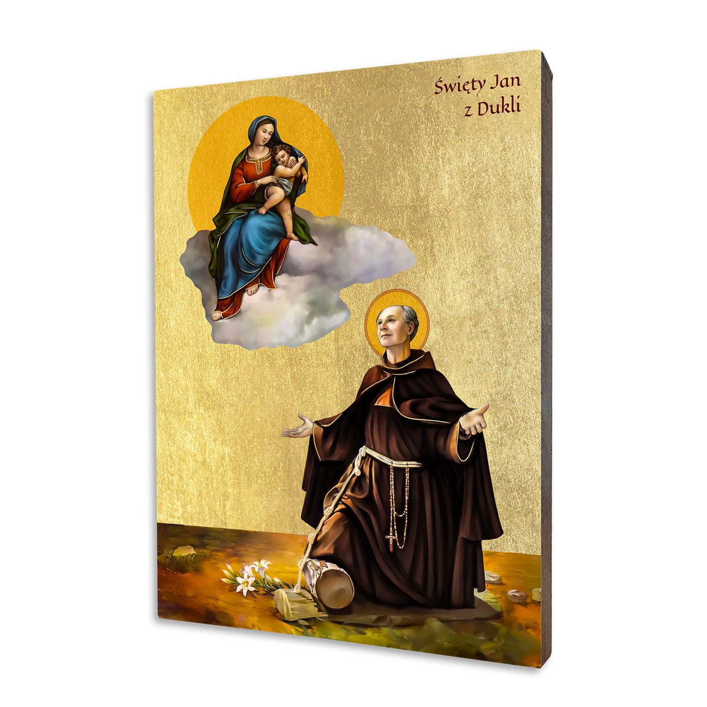 Ikona Świętego Jana z Dukli, wykonana została na podwójnie zagruntowanej desce lipowej. Drzewo zostało dodatkowo uszlachetnione pozłotą przypominają złoto płatkowe. Sam wizerunek naniesiony jest bezpośrednio na deskę przy użyciu specjalnej techniki druku. Ikona zabezpieczona specjalnym werniksem na bazie żywicy. Ze względu na swój piękny i estetyczny wygląd ikona może stanowić niezwykły prezent religijny na każdą okazję.