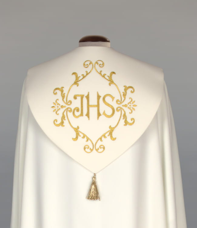 Kapa zdobiona haftami na pasach i kołnierzu. Zapięcie na elegancką klamrę z łańcuszkiem, kołnierz wykończony ozdobnym pomponem. Stuła wewnętrzna w komplecie.