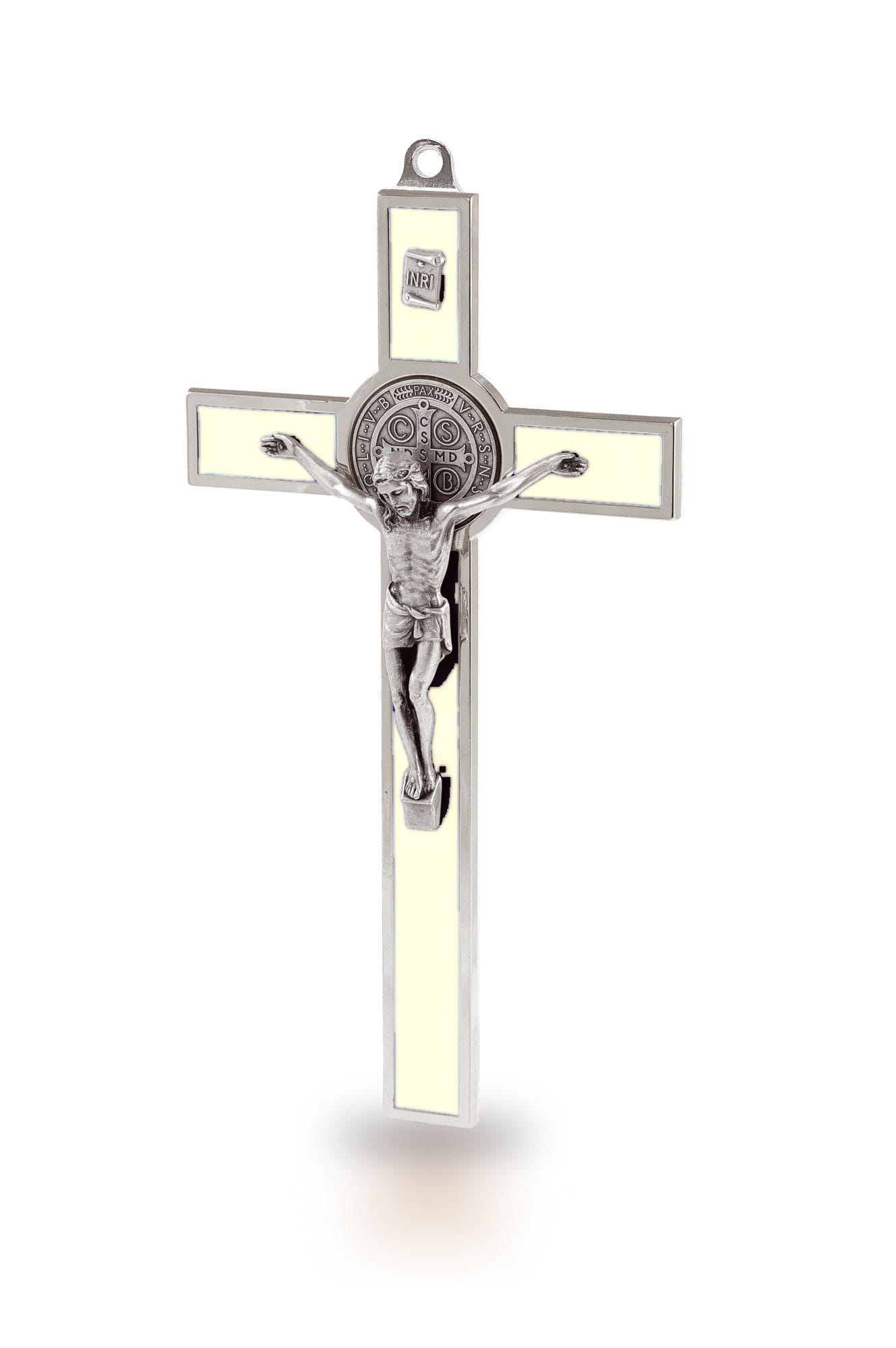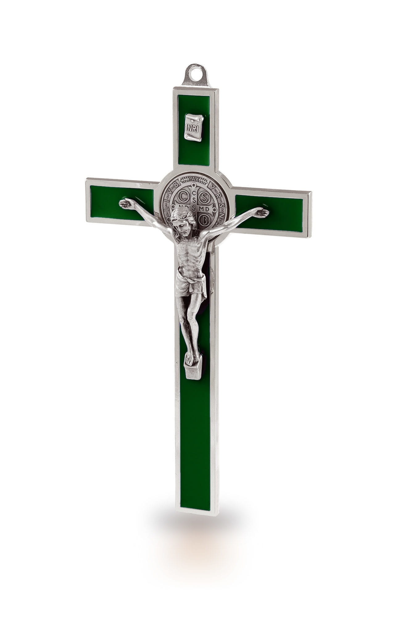 Krzyż charakteryzuje się solidną, srebrną metalową ramą, której wnętrze wypełnia kolorowa lakierowana emalia, dostępna aż w sześciu różnych wariantach: niebieskim, czerwonym, czarnym, zielonym, brązowym oraz fluoro. Umożliwia to dopasowanie krzyża do wystroju każdego wnętrza lub wybór koloru odpowiadającego osobistym preferencjom. W centrum krzyża umieszczono bogato zdobiony, metalowy korpus Chrystusa oraz, co kluczowe, potężny symbol ochronny – Medal Świętego Benedykta.