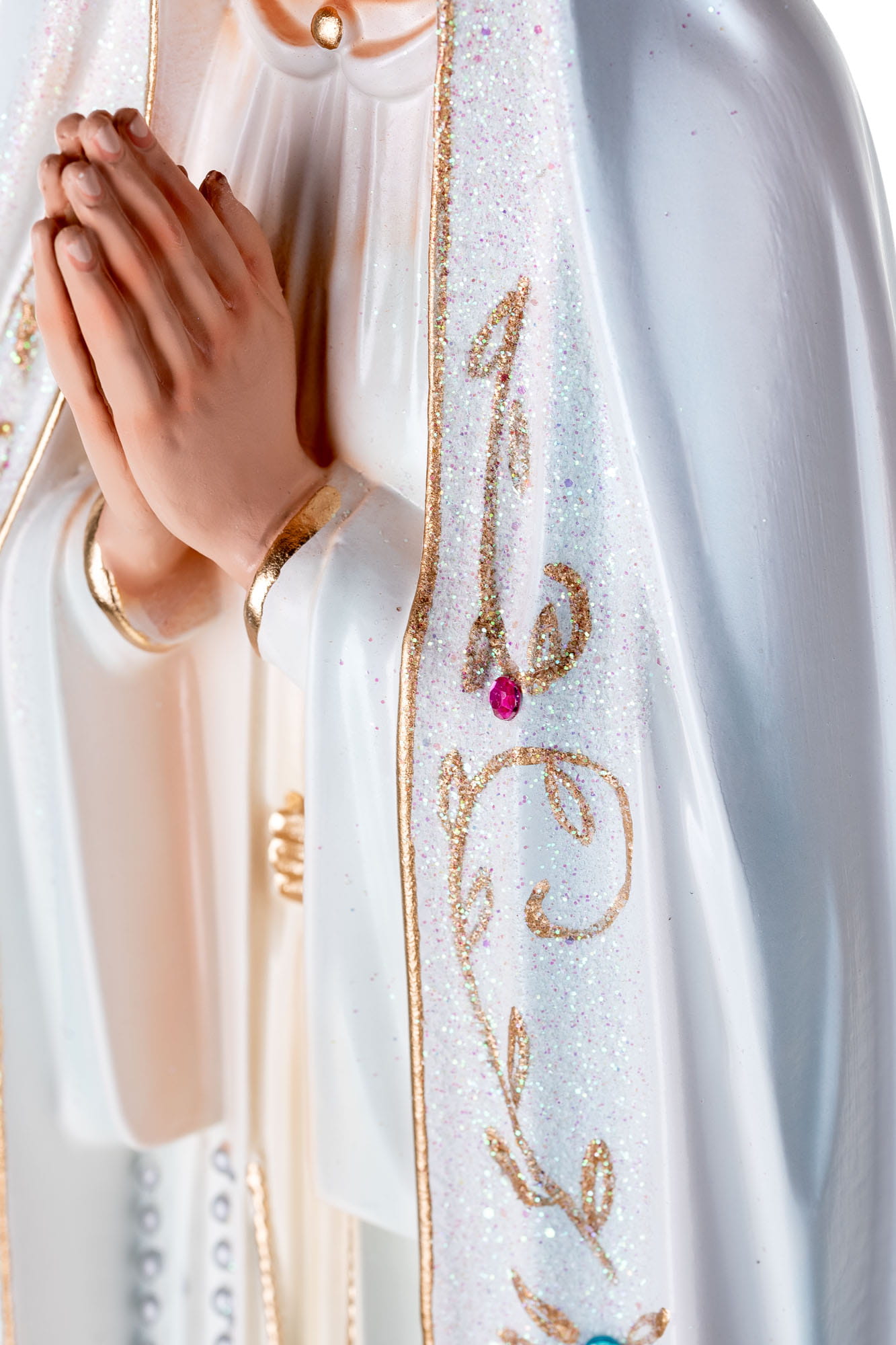 Figura Matki Bożej Fatimskiej o wysokości 76 cm, wykonana z trwałego tworzywa wysokiej jakości. Produkt został starannie ozdobiony brokatem, który nadaje mu wyjątkowego blasku i elegancji. Uwagę przyciągają kryształowe oczy, które nadają figurze niezwykłej głębi i realizmu.