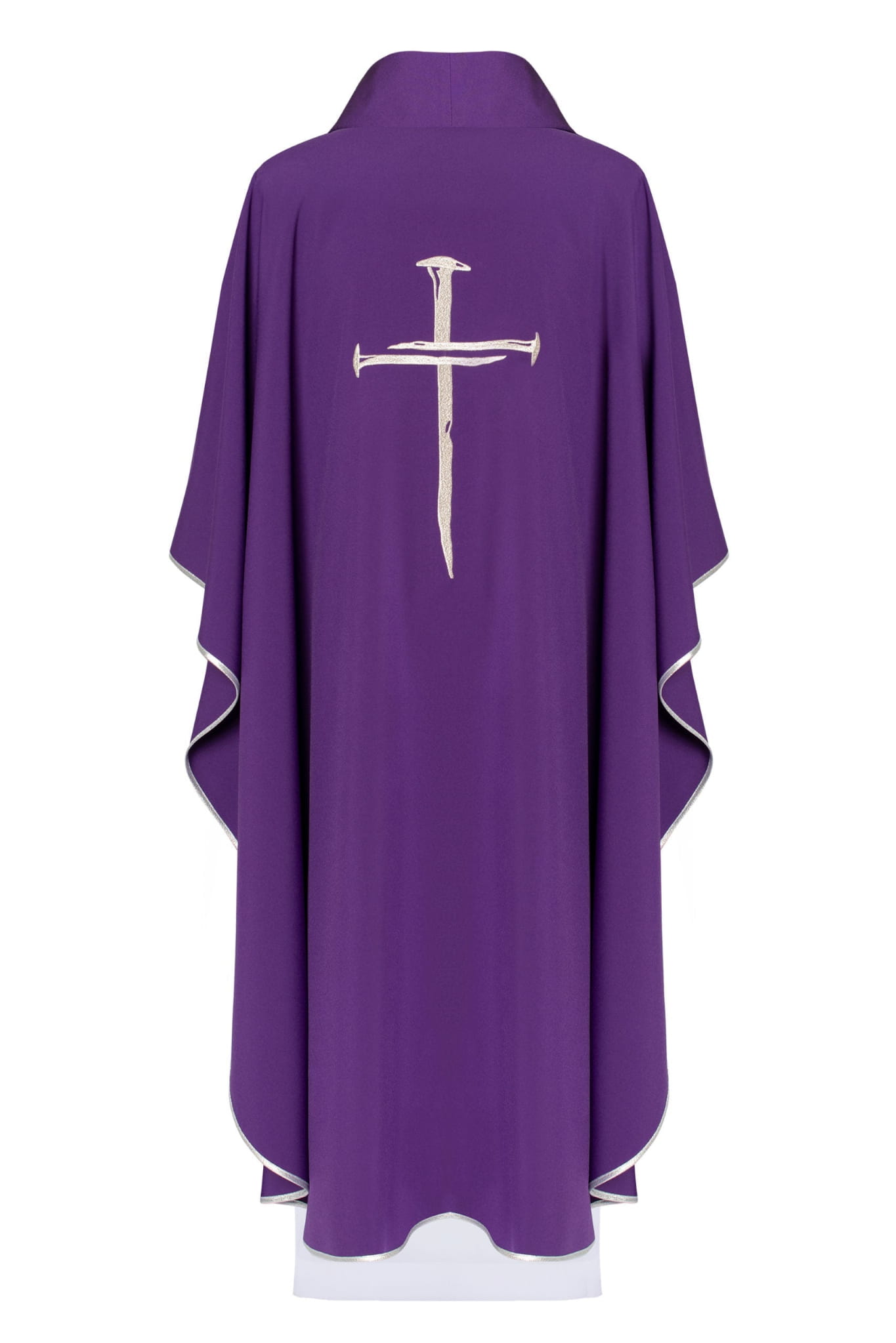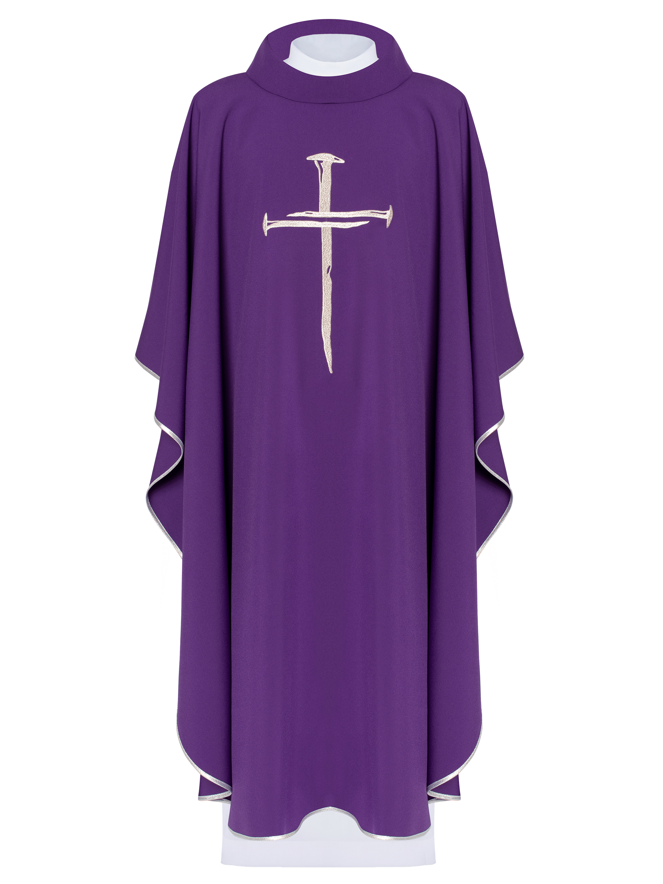 Ornat wykonany z wysokiej jakości tkaniny gładkiej, zdobiony haftowanym krzyżem. Całość wykończona srebrną lamówką.
