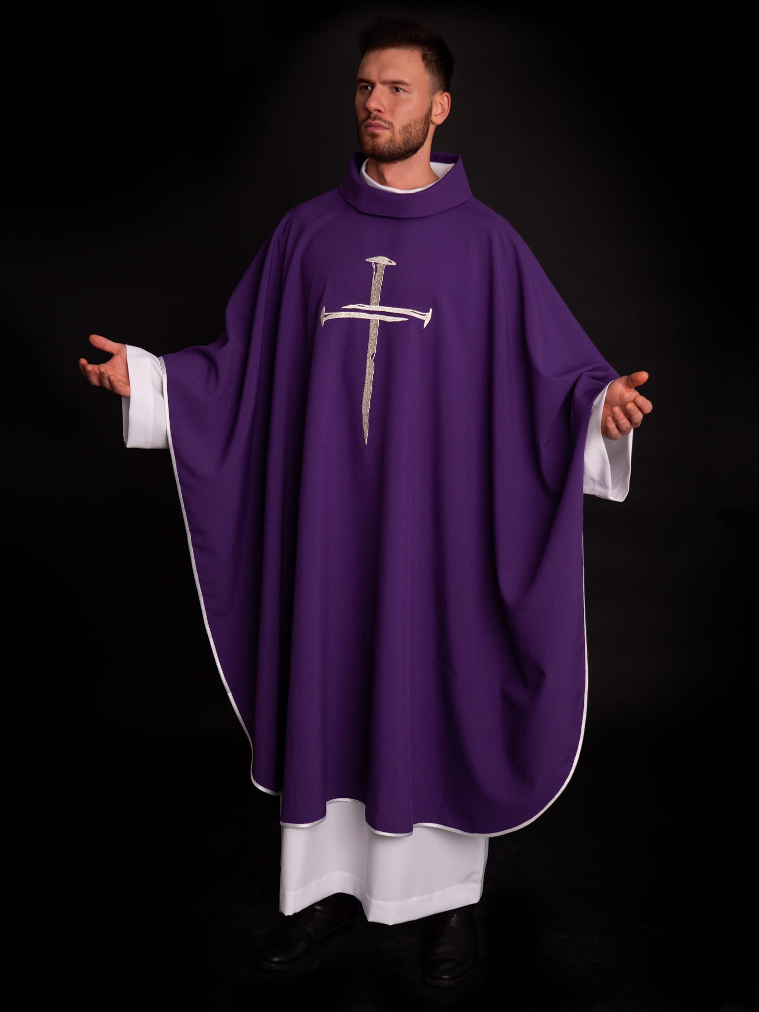 Ornat wykonany z wysokiej jakości tkaniny gładkiej, zdobiony haftowanym krzyżem.