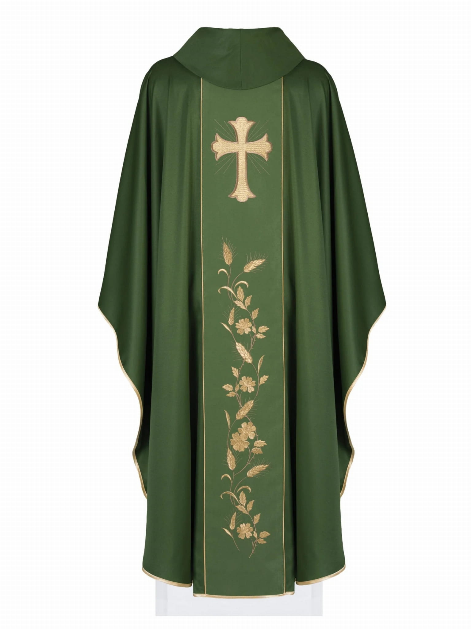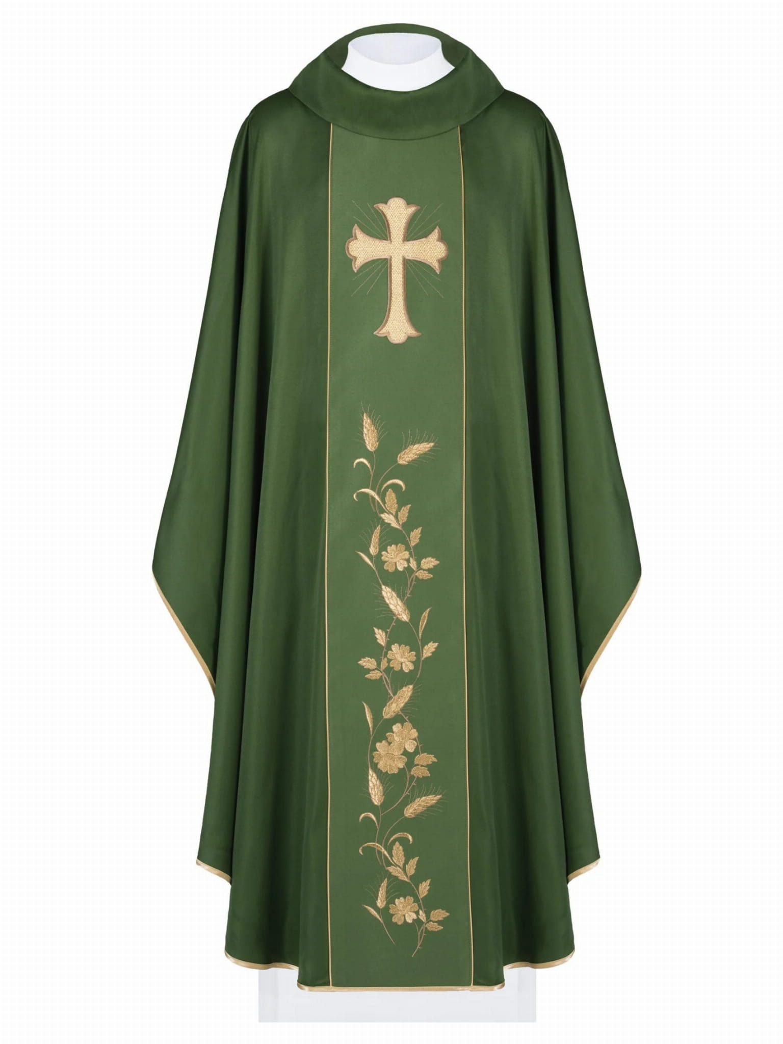 Ornat wykonano z wysokiej jakości tkaniny, zdobionej haftem z symbolem eucharystycznym, wykonanym złotymi nićmi, który przedstawia krzyż i kłosy. Dodatkowo brzegi ornatu wykończono satynową, złotą lamówką, która idealnie komponuje się z wyhaftowanym na złoto krzyżem i kłosami. Ponadto, ornat dostępny jest we wszystkich kolorach liturgicznych.