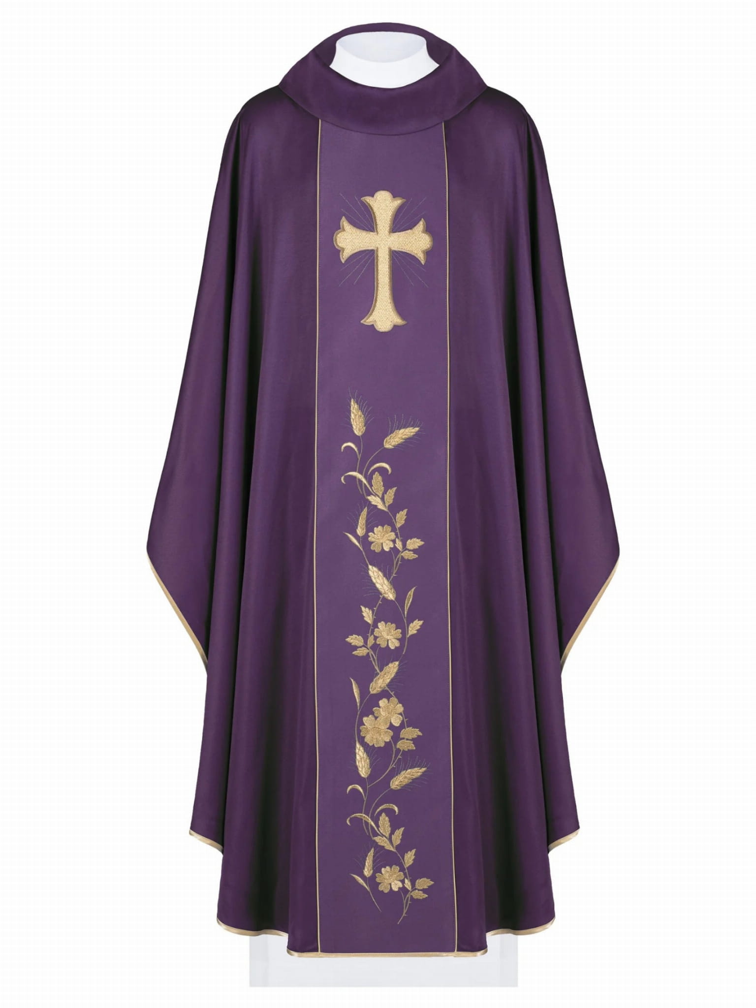 Ornat wykonano z wysokiej jakości tkaniny, zdobionej haftem z symbolem eucharystycznym, wykonanym złotymi nićmi, który przedstawia krzyż i kłosami. Dodatkowo brzegi ornatu wykończono satynową, złotą lamówką, która idealnie komponuje się z wyhaftowanym na złoto krzyżem i kłosami. Ponadto, ornat dostępny jest we wszystkich kolorach liturgicznych.