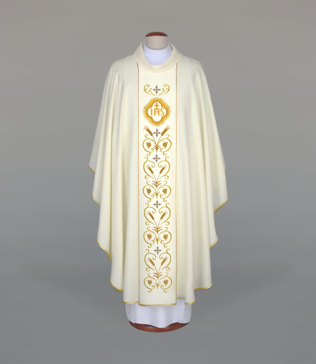 Ornat zdobiony bogatym haftem, wykonanym na atłasowym pasie. Kołnierz typu golf. Ornat wykonany z lekkiej, przewiewnej i przyjemnej w dotyku tkaniny o strukturze przypominającej len. Całość wykończony złotą, brokatową lamówką. Stuła wewnętrzna w komplecie. Szata dostępna również w innych kolorach liturgicznych.