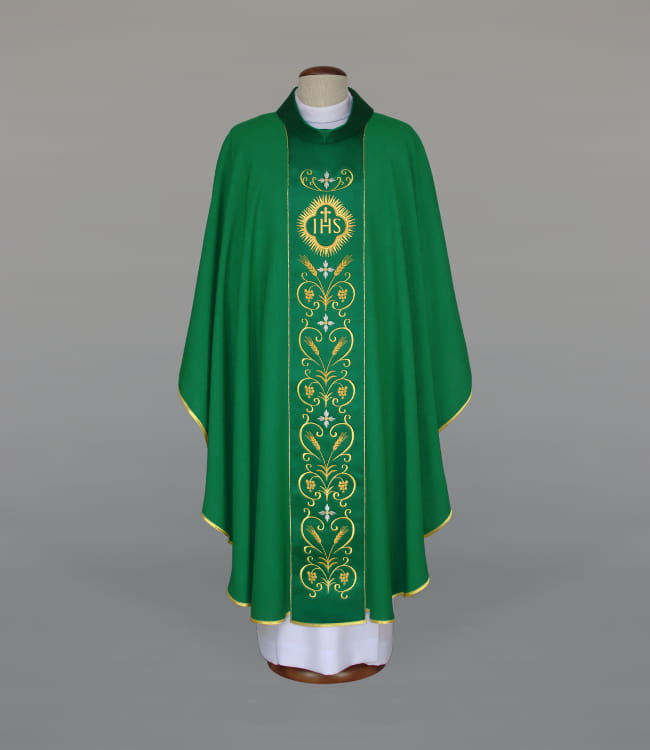 Ornat zdobiony bogatym haftem, wykonanym na atłasowym pasie. Kołnierz typu golf. Ornat wykonany z lekkiej, przewiewnej i przyjemnej w dotyku tkaniny o strukturze przypominającej len. Całość wykończony złotą, brokatową lamówką. Stuła wewnętrzna w komplecie. Szata dostępna również w innych kolorach liturgicznych.