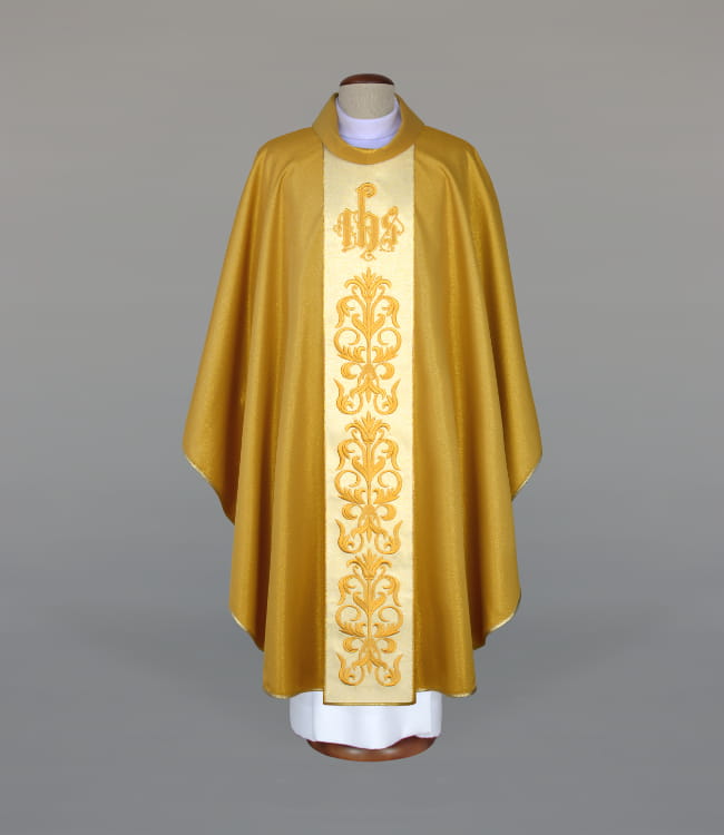 Ornat zdobiony bogatym haftem, wykonanym na jasnym pasie. Kołnierz typu golf. Ornat wykonany z lekkiej, brokatowej tkaniny o kolorze starego złota. Całość wykończony złotą, brokatową lamówką. Stuła wewnętrzna w komplecie. Szata dostępna również w innych kolorach liturgicznych.