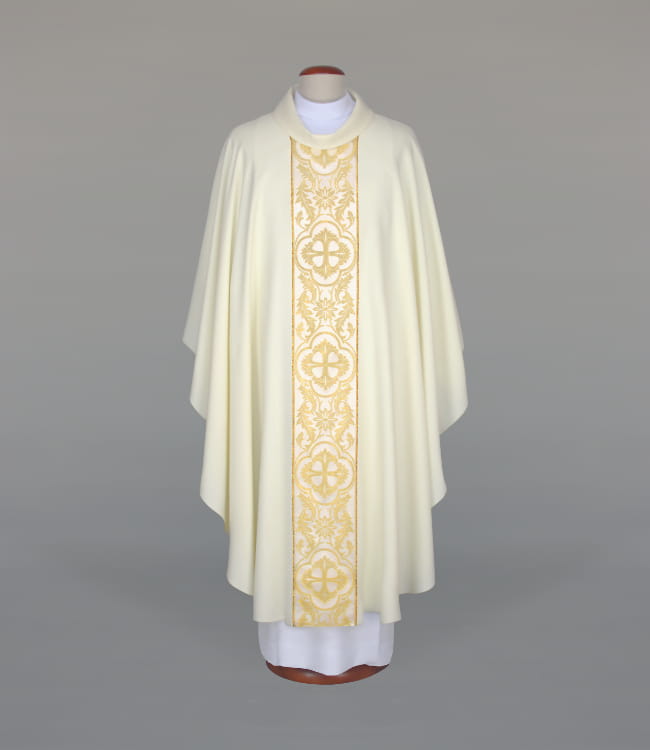 Ornat zdobiony eleganckim tkanym pasem, wykończony atłasową lamówką. Kołnierz typu golf. Ornat wykonany z lekkiej, przewiewnej i przyjemnej w dotyku tkaniny o strukturze przypominającej len. Stuła wewnętrzna w komplecie. Szata dostępna również w innych kolorach liturgicznych.