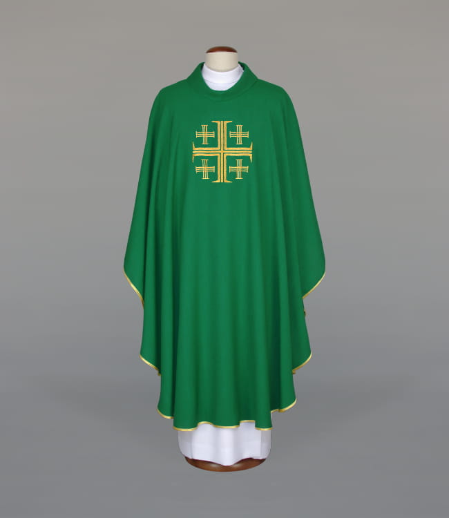 Ornat zdobiony haftem, wykończony złotą, brokatową lamówką. Kołnierz typu golf. Ornat wykonany z lekkiej, przewiewnej i przyjemnej w dotyku tkaniny o strukturze przypominającej len. Stuła wewnętrzna w komplecie. Szata dostępna również w innych kolorach liturgicznych.