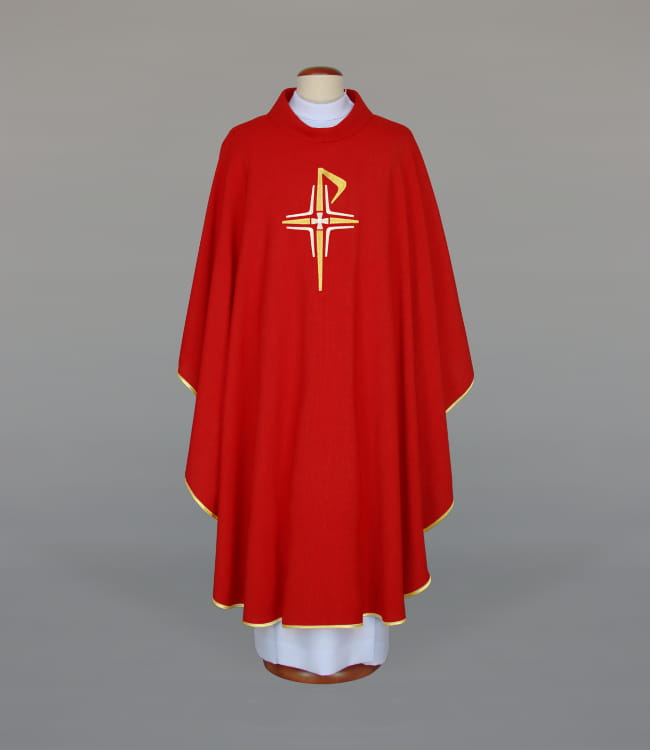 Ornat zdobiony haftem, wykończony złotą, brokatową lamówką. Kołnierz typu golf. Ornat wykonany z lekkiej, przewiewnej i przyjemnej w dotyku tkaniny o strukturze przypominającej len. Stuła wewnętrzna w komplecie. Szata dostępna również w innych kolorach liturgicznych.