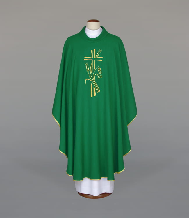 Ornat zdobiony haftem, wykończony złotą, brokatową lamówką. Kołnierz typu golf. Ornat wykonany z lekkiej, przewiewnej i przyjemnej w dotyku tkaniny o strukturze przypominającej len. Stuła wewnętrzna w komplecie. Szata dostępna również w innych kolorach liturgicznych.