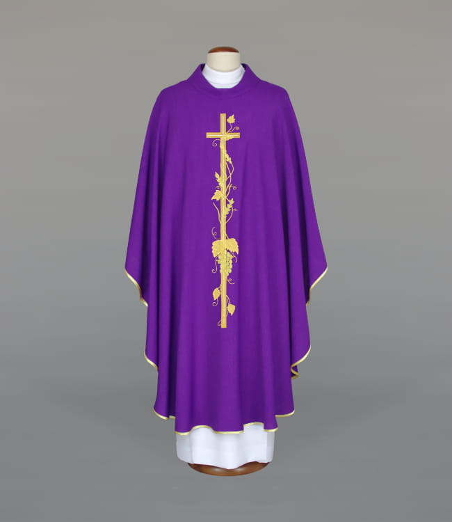 Ornat zdobiony haftem, wykończony złotą, brokatową lamówką. Kołnierz typu golf. Ornat wykonany z lekkiej, przewiewnej i przyjemnej w dotyku tkaniny o strukturze przypominającej len. Stuła wewnętrzna w komplecie. Szata dostępna również w innych kolorach liturgicznych.