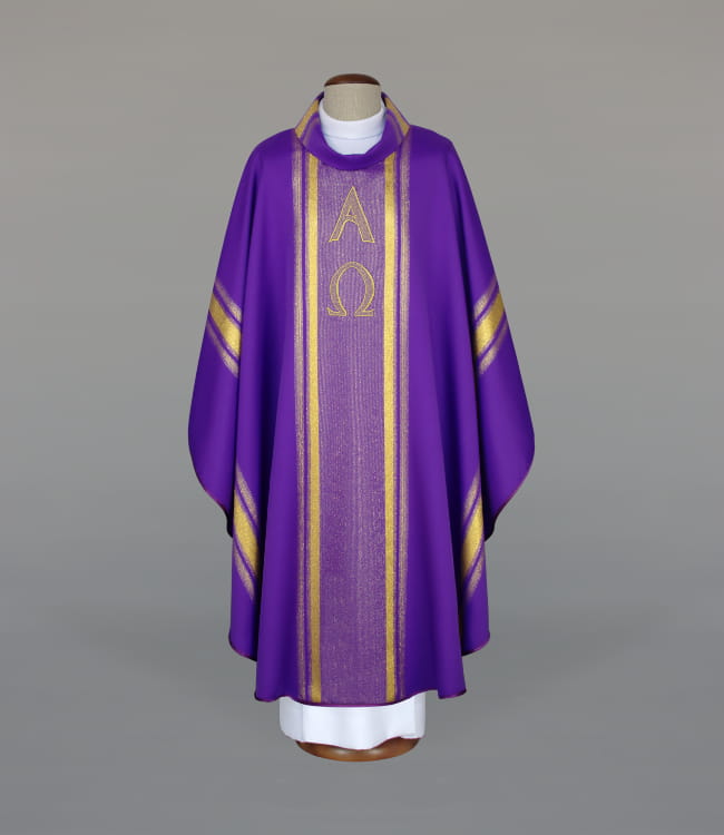 Ornat zdobiony haftem, wykończony atłasową lamówką. Kołnierz typu golf. Ornat wykonany z lekkiej, ozdobnej tkaniny z efektownymi, brokatowymi pasami. Stuła wewnętrzna w komplecie. Szata dostępna również w innych kolorach liturgicznych.