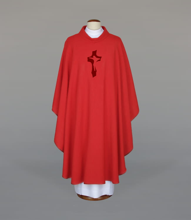 Ornat zdobiony haftem, wykończony atłasową lamówką. Kołnierz typu golf. Ornat wykonany z lekkiej, przewiewnej tkaniny. Stuła wewnętrzna w komplecie. Szata dostępna również w innych kolorach liturgicznych.