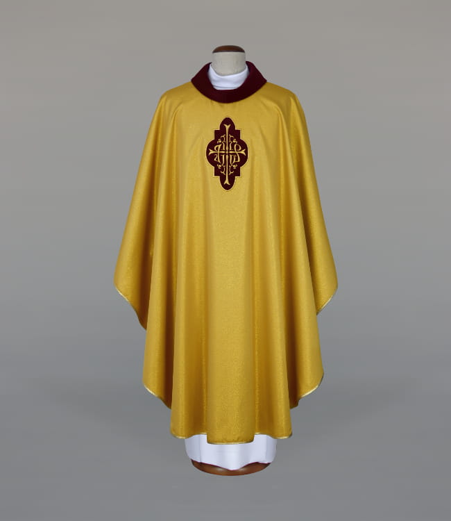 Ornat zdobiony kombinacją haftu i aksamitnych aplikacji, wykończony złotą, brokatową lamówką. Kołnierz typu golf, również z aksamitu. Całość wykonana z lekkiej, brokatowej tkaniny o kolorze starego złota. Stuła wewnętrzna w komplecie. Szata dostępna również w innych kolorach liturgicznych.