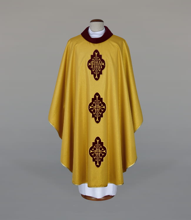 Ornat zdobiony kombinacją haftu i aksamitnych aplikacji, wykończony złotą, brokatową lamówką. Kołnierz typu golf, również z aksamitu. Całość wykonana z lekkiej, brokatowej tkaniny o kolorze starego złota. Stuła wewnętrzna w komplecie. Szata dostępna również w innych kolorach liturgicznych.