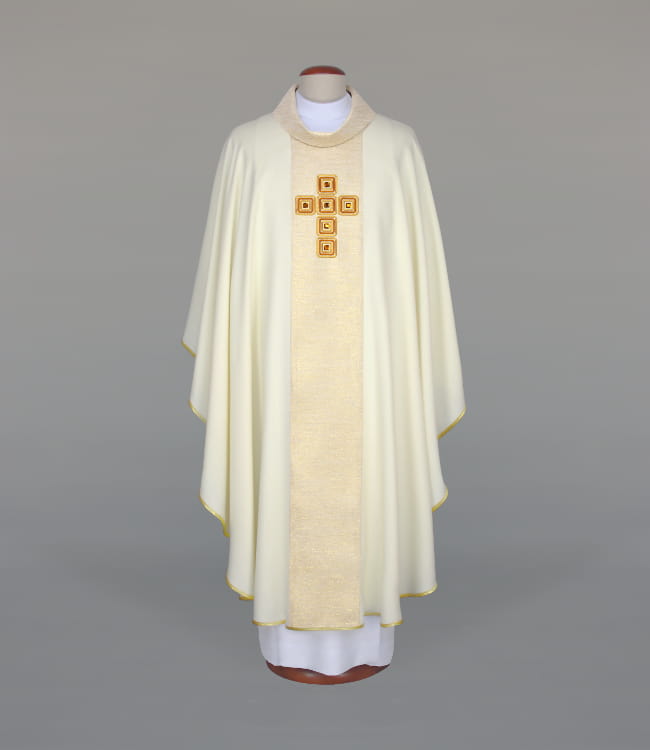 Ornat zdobiony kombinacją nowoczesnego haftu i efektownych kamieni. Kołnierz typu golf, podobnie jak pas ornatu, wykonany jest z ozdobnej tkaniny, przetykanej złotą nicią. Ornat wykonany z lekkiego, przewiewnego materiału, wykończony złotą, brokatową lamówką. Stuła wewnętrzna w komplecie. Szata dostępna również w innych kolorach liturgicznych.
