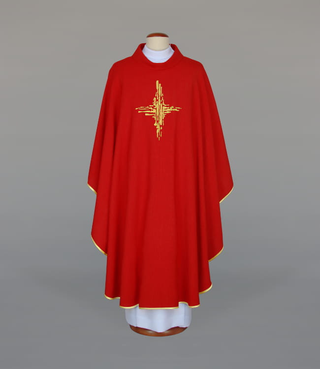 Ornat zdobiony nowoczesnym haftem, wykończony złotą, brokatową lamówką. Kołnierz typu golf. Ornat wykonany z lekkiej, przewiewnej i przyjemnej w dotyku tkaniny o strukturze przypominającej len. Stuła wewnętrzna w komplecie. Szata dostępna również w innych kolorach liturgicznych.
