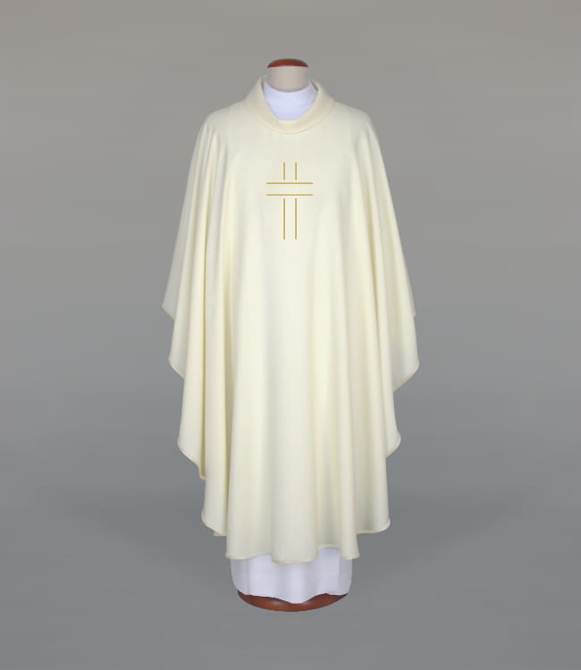 Ornat zdobiony nowoczesnym haftem, wykończony atłasową lamówką. Kołnierz typu golf. Ornat wykonany z lekkiej, przewiewnej tkaniny. Stuła wewnętrzna w komplecie. Szata dostępna również w innych kolorach liturgicznych.