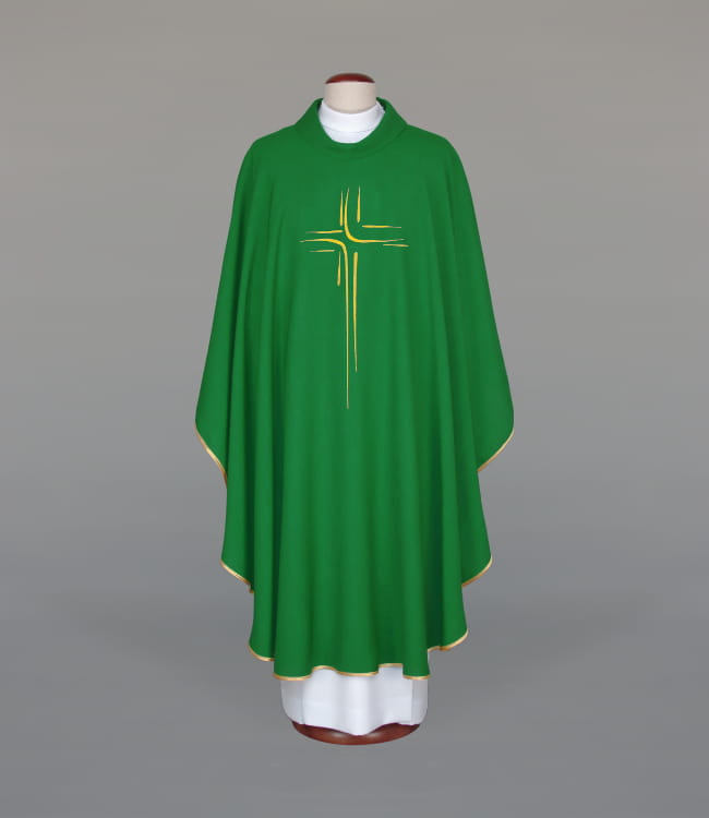 Ornat zdobiony nowoczesnym haftem, wykończony złotą, brokatową lamówką. Kołnierz typu golf. Ornat wykonany z lekkiej, przewiewnej tkaniny. Stuła wewnętrzna w komplecie. Szata dostępna również w innych kolorach liturgicznych.