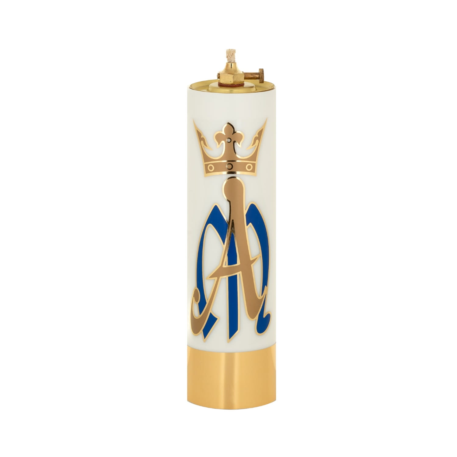 Świeca liturgiczna w kolorze białym z emblematem Maryjnym z bardzo trwałego tworzywa doskonale imitującego prawdziwą parafinę. Posiada wkład olejowy regulowany lub bez regulacji.