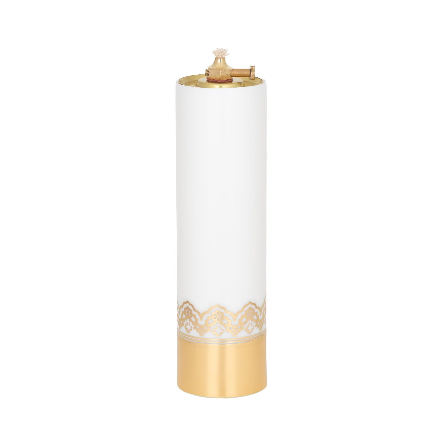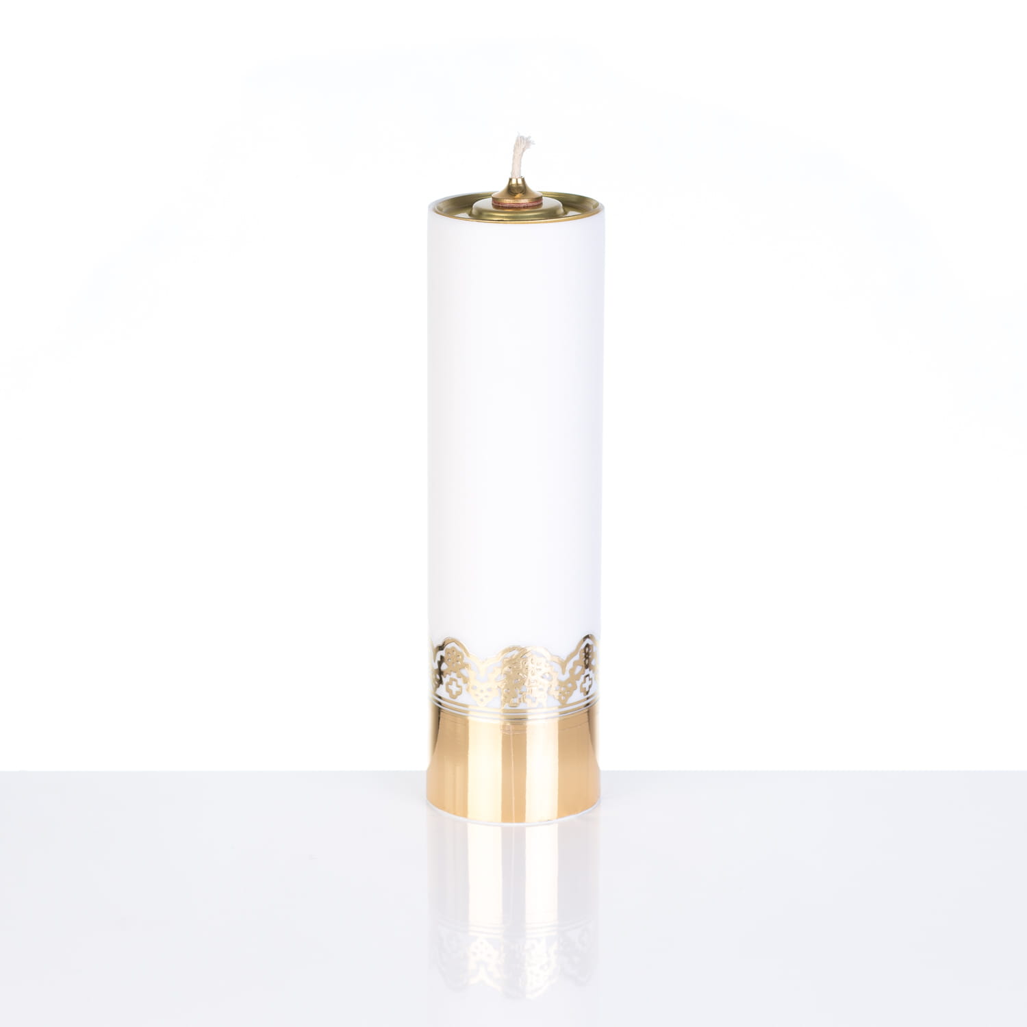 Świeca liturgiczna w kolorze białym z bardzo trwałego tworzywa doskonale imitującego prawdziwą parafinę. Posiada wkład olejowy regulowany lub bez regulacji.
