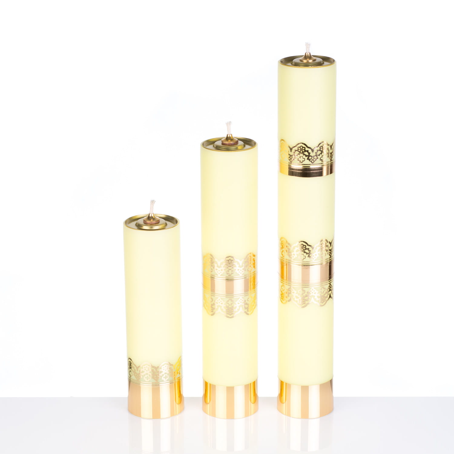 Świeca liturgiczna w kolorze żółtym z bardzo trwałego tworzywa doskonale imitującego prawdziwą parafinę. Posiada wkład olejowy regulowany lub bez regulacji.