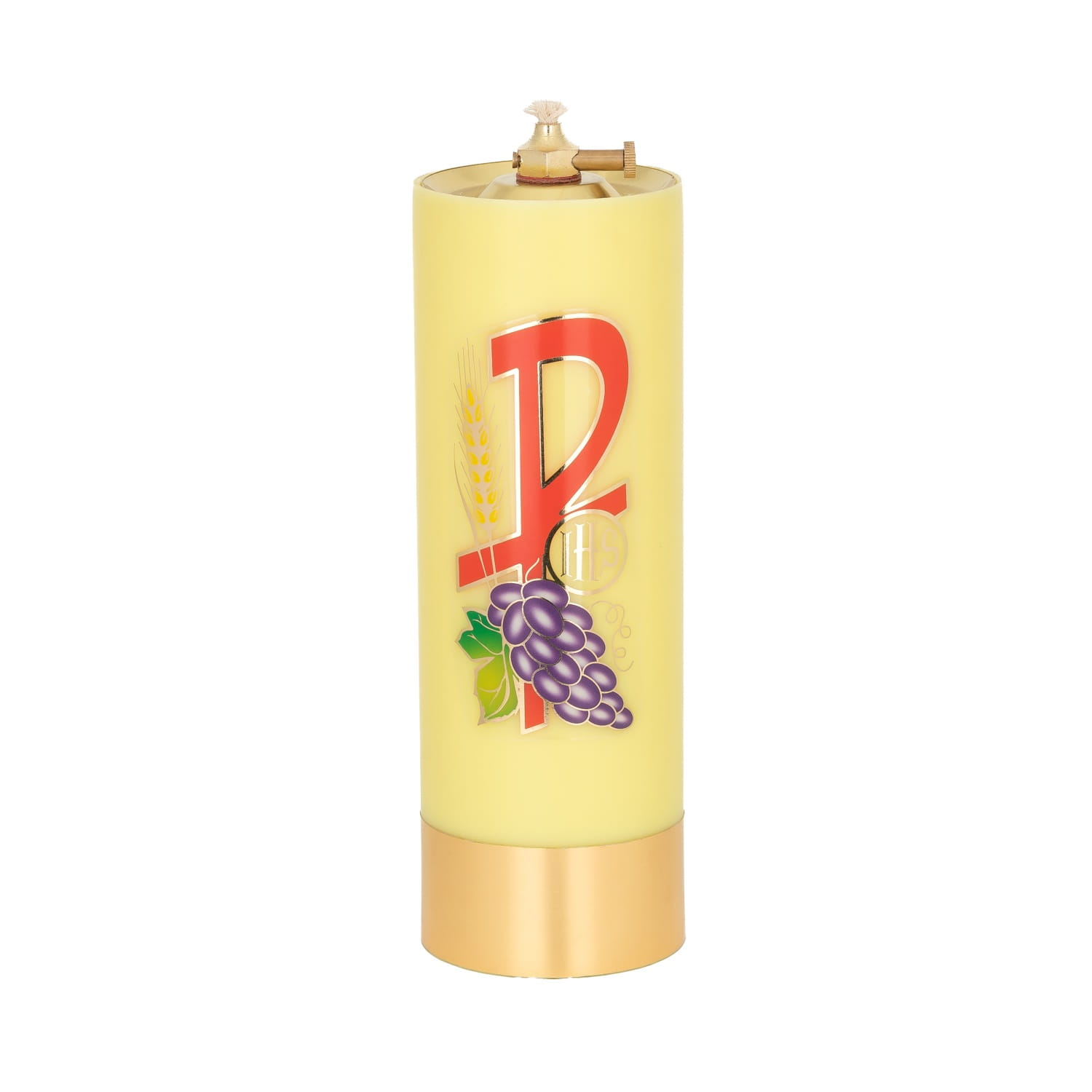 Świeca liturgiczna w kolorze żółtym z emblematem IHS z bardzo trwałego tworzywa doskonale imitującego prawdziwą parafinę. Posiada wkład olejowy regulowany lub bez regulacji.