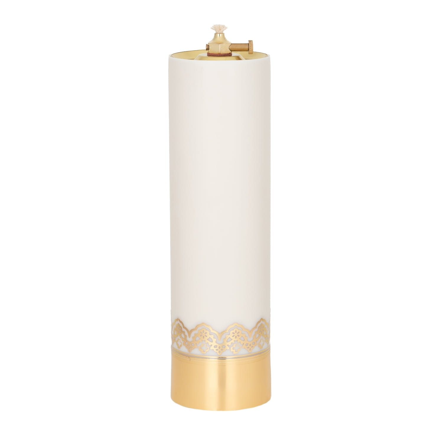 Świeca liturgiczna w kolorze białym z bardzo trwałego tworzywa doskonale imitującego prawdziwą parafinę. Posiada wkład olejowy regulowany lub bez regulacji.