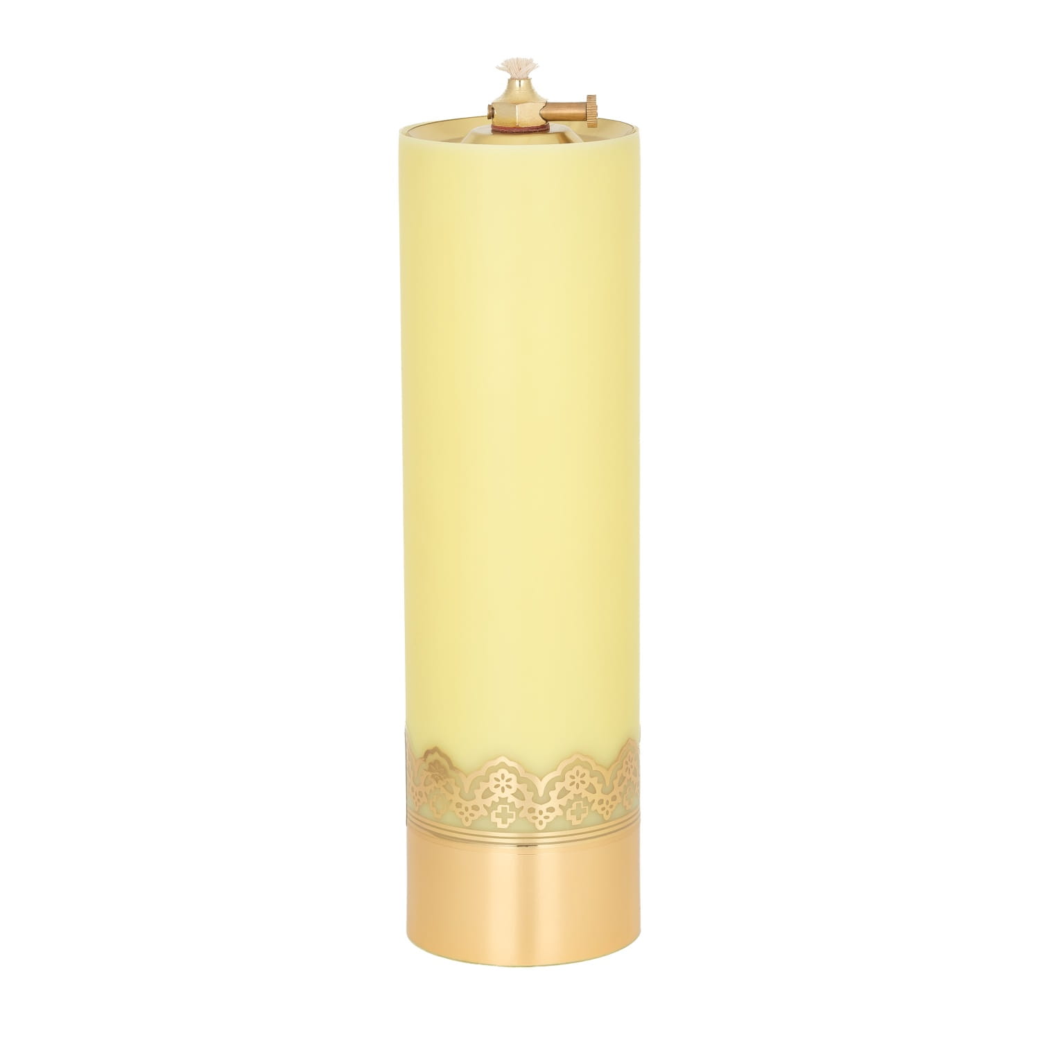 Świeca liturgiczna w kolorze żółtym z bardzo trwałego tworzywa doskonale imitującego prawdziwą parafinę. Posiada wkład olejowy regulowany lub bez regulacji