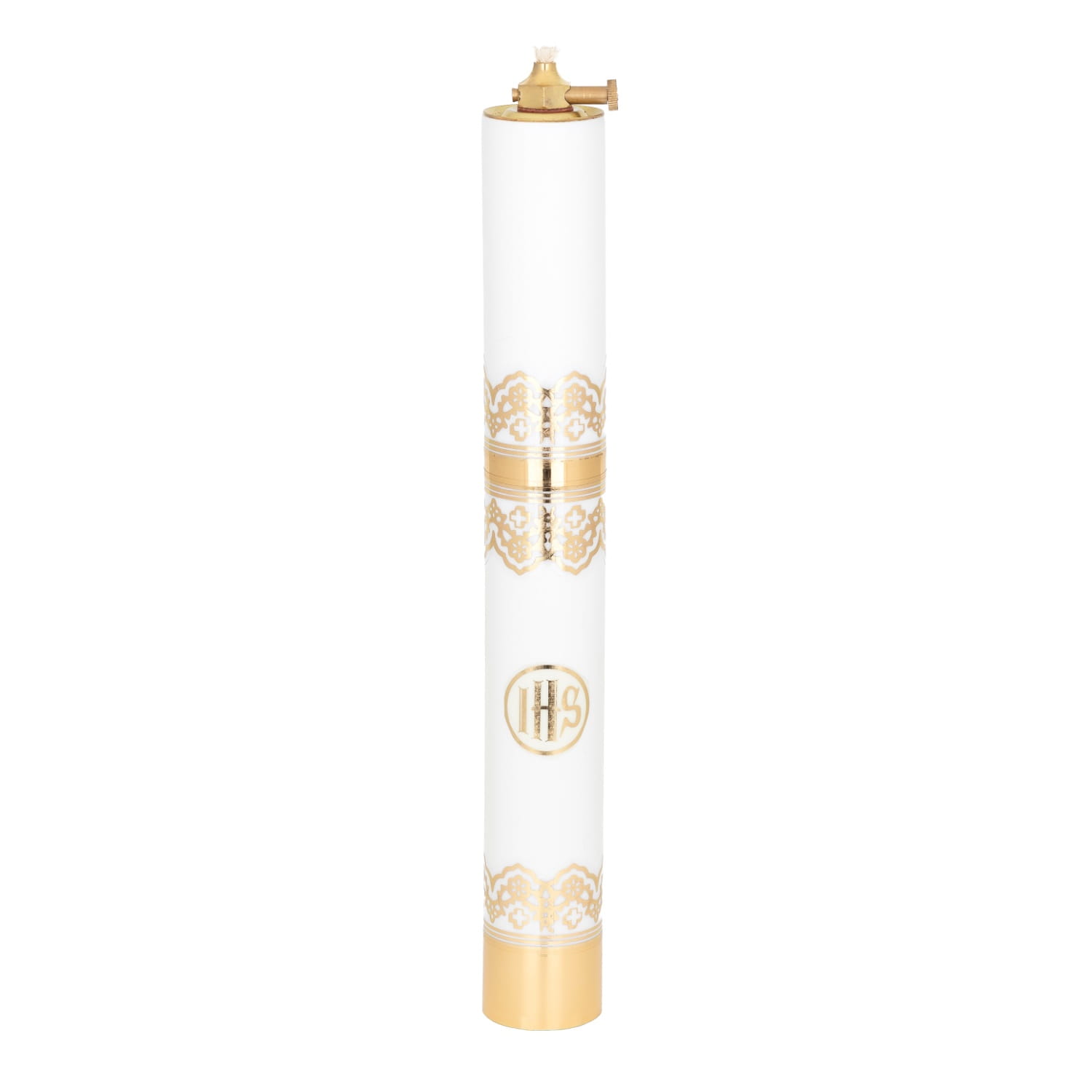 Świeca liturgiczna w kolorze białym z emblematem IHS z bardzo trwałego tworzywa doskonale imitującego prawdziwą parafinę. Posiada wkład olejowy regulowany lub bez regulacji.