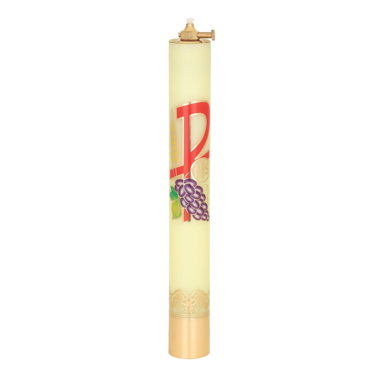 Świeca liturgiczna w kolorze żółta z emblematem PAX z bardzo trwałego tworzywa doskonale imitującego prawdziwą parafinę. Posiada wkład olejowy regulowany lub bez regulacji.