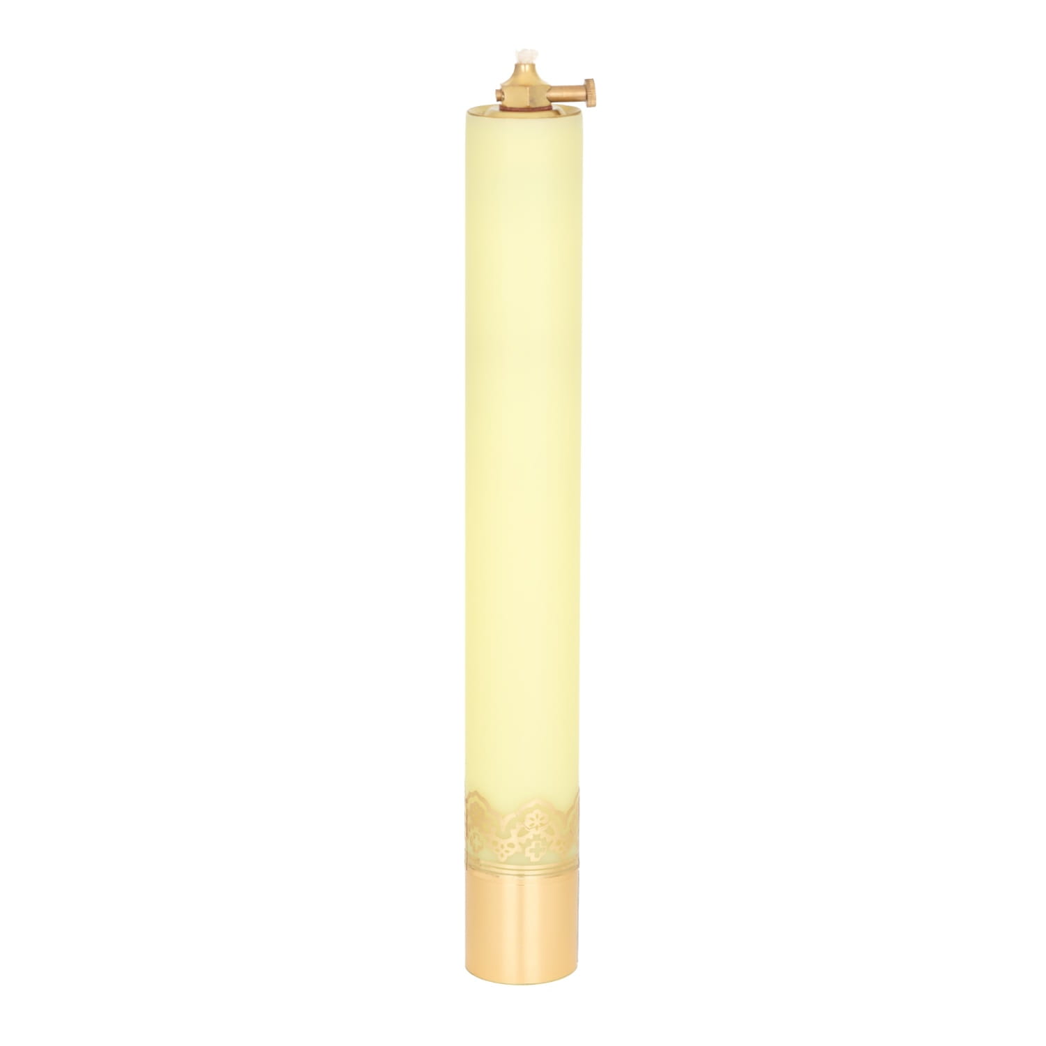 Świeca liturgiczna w kolorze żółta z bardzo trwałego tworzywa doskonale imitującego prawdziwą parafinę. Posiada wkład olejowy regulowany lub bez regulacji.