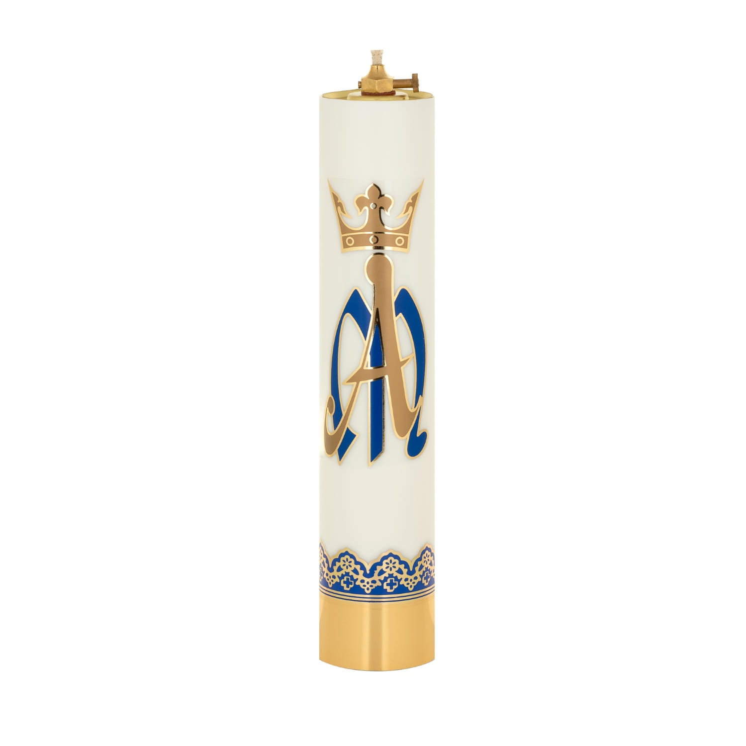 Świeca liturgiczna w kolorze delikatnego ecru z emblematem Maryjnym z bardzo trwałego tworzywa doskonale imitującego prawdziwą parafinę. Posiada wkład olejowy regulowany lub bez regulacji.