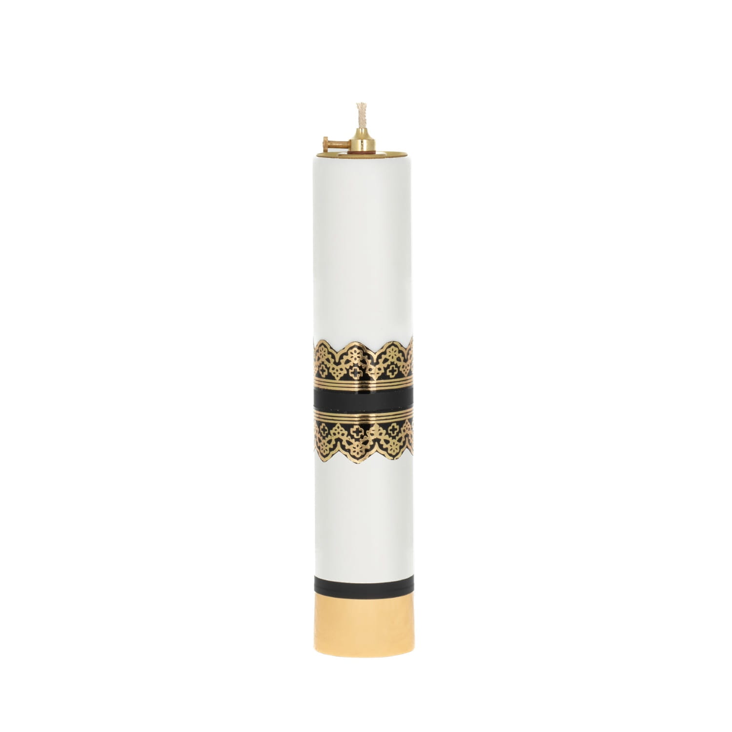 Pogrzebowa świeca liturgiczna w kolorze białym z czarnym paskiem z bardzo trwałego tworzywa doskonale imitującego prawdziwą parafinę. Posiada wkład olejowy regulowany lub bez regulacji.