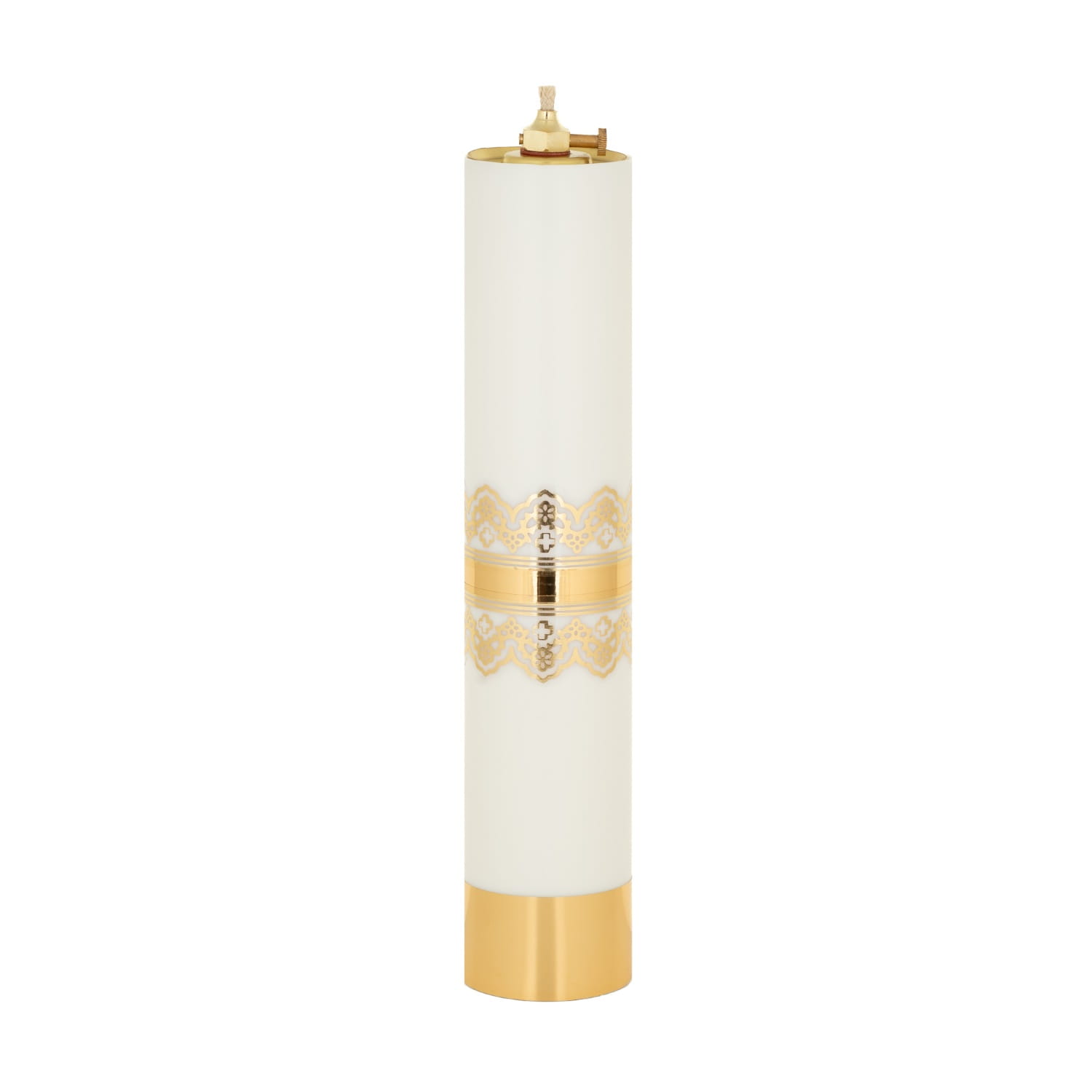 Świeca liturgiczna w kolorze białym z bardzo trwałego tworzywa doskonale imitującego prawdziwą parafinę. Posiada wkład olejowy regulowany lub bez regulacji.