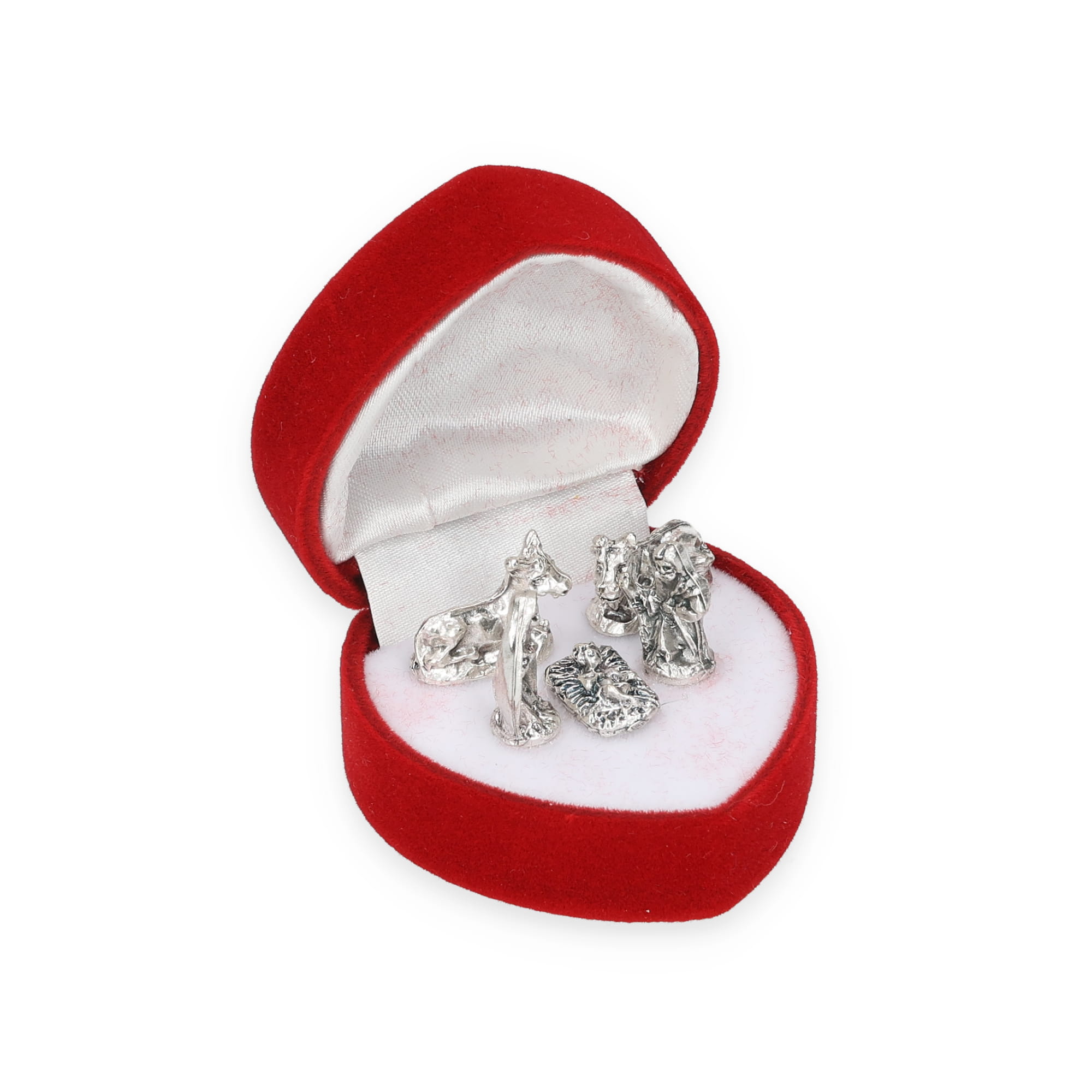 Odkryj uroczą i symboliczną pamiątkę, idealną na prezent z okazji Bożego Narodzenia. Ten zestaw zawiera miniaturowe, metalowe figurki przedstawiające scenę Bożego Narodzenia: Dzieciątko Jezus w żłóbku, Maryję, Józefa, wołu i osła. Całość umieszczono w pięknym, welurowym pudełeczku w kształcie serca, w intensywnym, czerwonym kolorze.