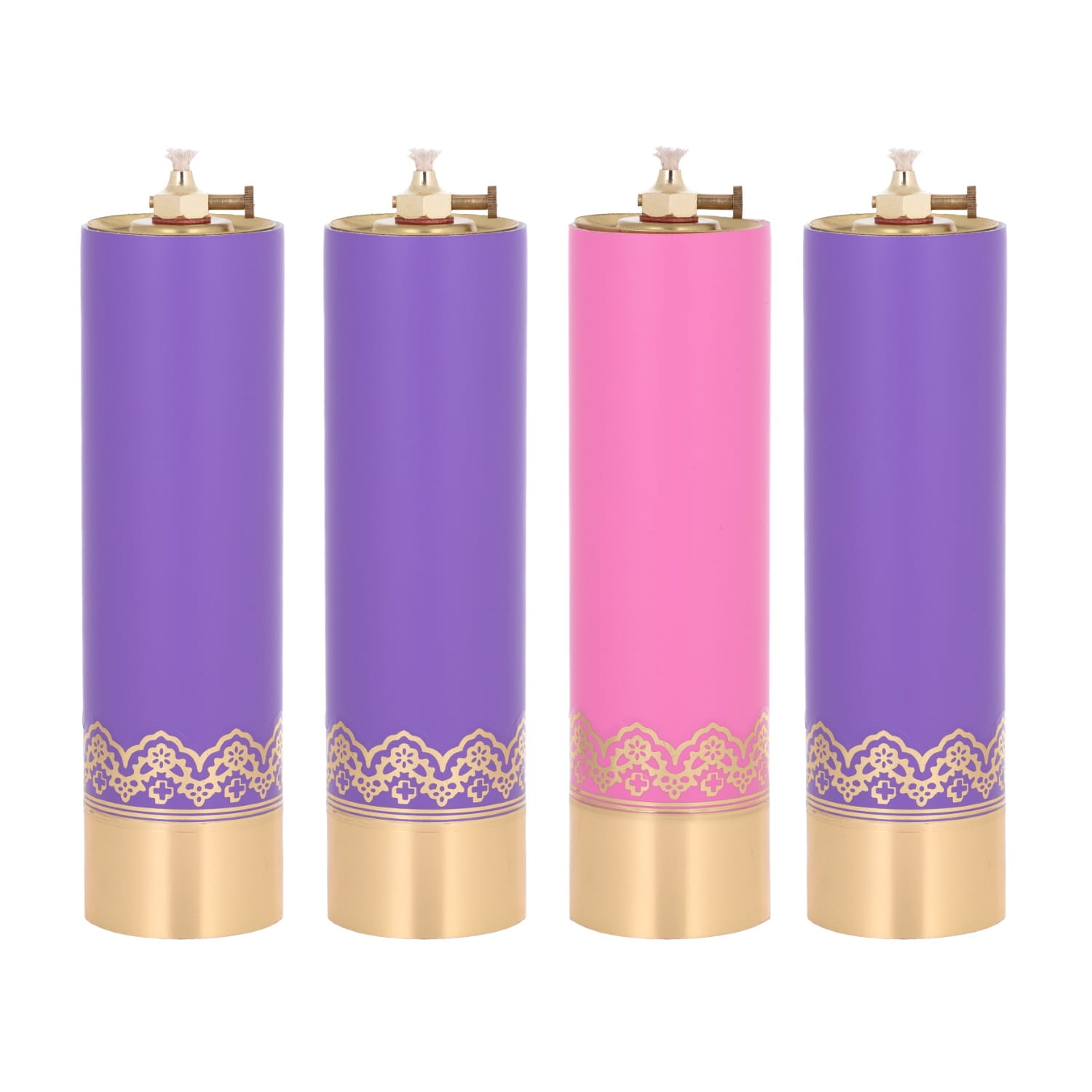 Komplet adwentowych świec liturgicznych w kolorze fioletowym i różowym wykonanych z bardzo trwałego tworzywa. Posiadają wkład olejowy regulowany lub bez regulacji.