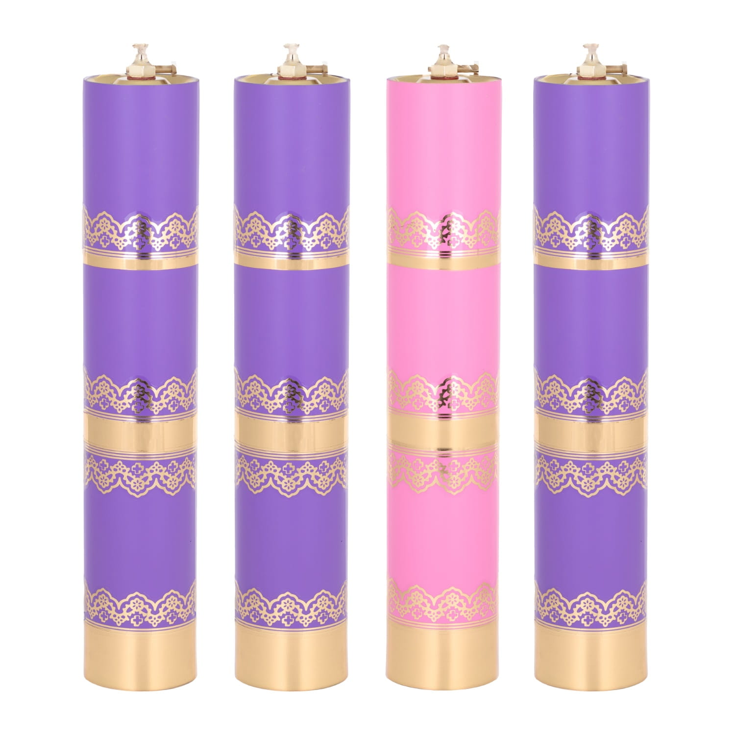 Komplet adwentowych świec liturgicznych w kolorze fioletowym i różowym wykonanych z bardzo trwałego tworzywa. Posiadają wkład olejowy regulowany lub bez regulacji.